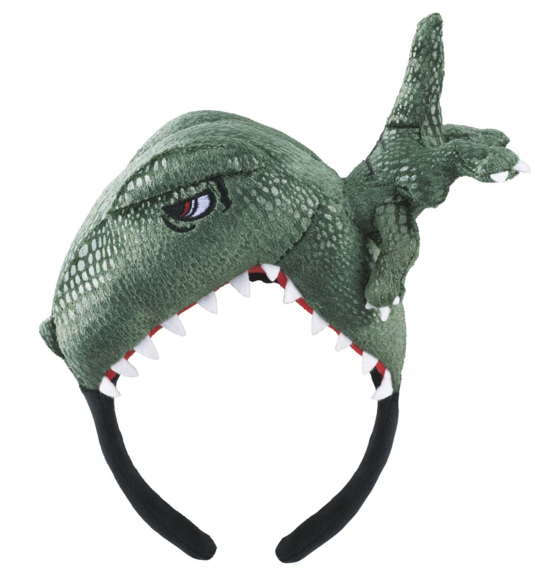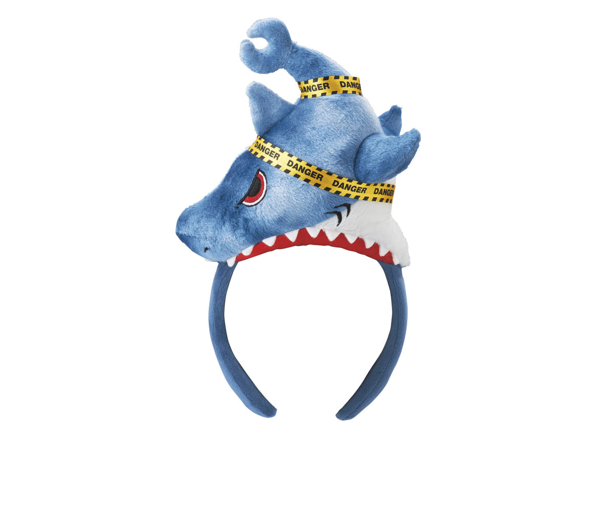 「DANGER」と書かれたテープをボディに巻いたサメデザインのカチューシャ。